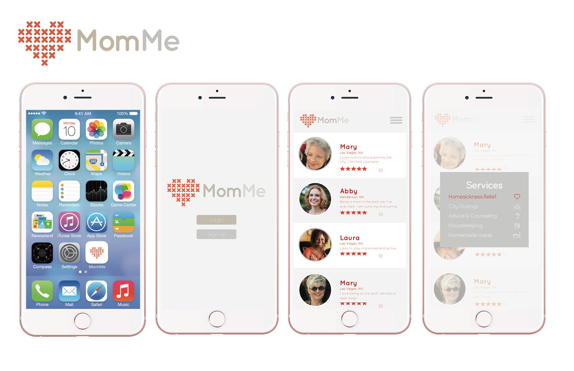 Student work: Branding and logo design for a fictional mom for hire app.